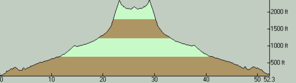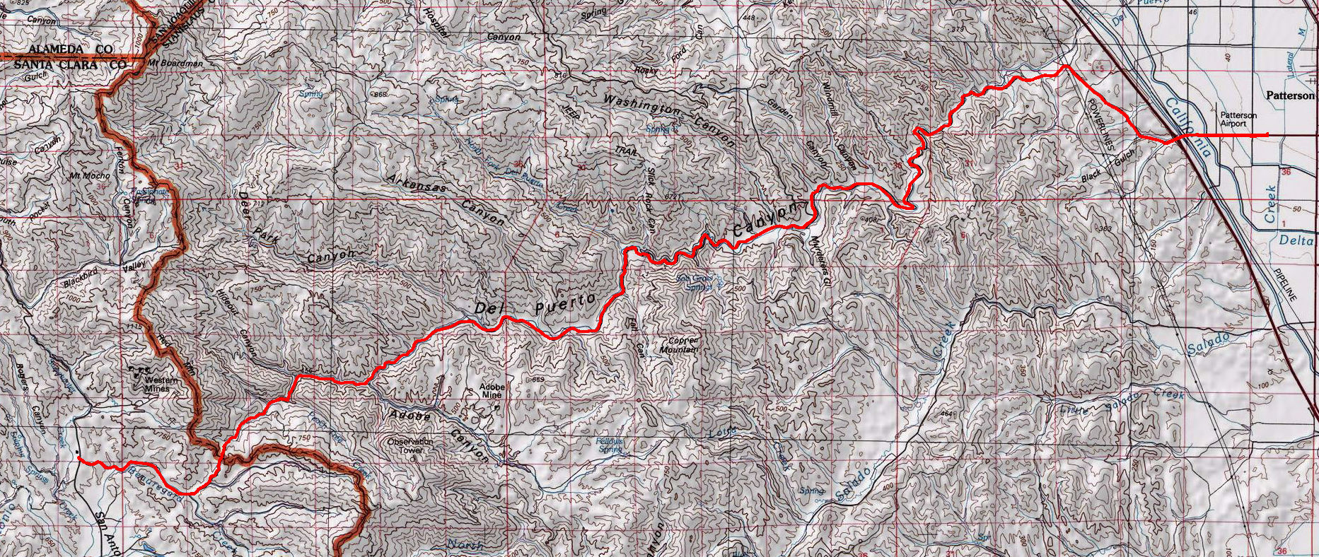 Del Puerto Canyon Road 100% ROAD ![]() The "SCU Lightning Complex" wildfires of 2020 have burned an area that encompasses almost the entire route of this ride. Keep in mind that the scenery of this ride may, therefore, look substantially different from what my ride photos linked from this page currently represent. On top of that, the proposed Del Puerto Canyon Reservoir dam may be complicating matters further for at least the eastern half of the route by the time you read this. Del Puerto Canyon Road isn't exactly one of the commonly discussed ride routes among Bay Area road cyclists, as far as I understand. This fact is fairly understandable given its relative remoteness and its somewhat awkward starting point for those who'd prefer to do it in the order of "first climb then descend". That same obscurity also qualifies this ride as a hidden gem in my book, however. Done in the right season, the ride is wonderfully idyllic and a great majority of its mileage is within the physical capabilities of even the most modest riders. Even the drive to get there isn't much longer than what some of us would need to undertake to reach what I consider some Bay Area rides (like getting to Santa Cruz or to Fort Ord from San Francisco) for those who can use the fast freeways I-580 and I-5 to get there. I discovered this ride through Jay Rawlins' excellent road-ride website "Jay's Essential Bike Rides". The selection of rides on Jay's site combines great coverage with tasteful and informed selection. I would heartily recommend his website to anyone who looks for Bay Area road ride information online. His material covers all the essential information for each ride as well as adding plenty of useful firsthand detail and tips. The route follows a road from beginning to end as it heads from right by Interstate 5 halfway to the peak of Mount Hamilton. The ride can be described as 50 miles of a pleasure cruise in a pretty landscape and 2 miles of torment. Seeing the roughly triangular shape of the elevation profile plot, one might think of this as an out-and-back ride on a climbing road but, in reality, the first 20 or 21 miles of the ride are essentially flat (though this does include a two- or three-mile stretch that needs a little work) and the climb doesn't really begin until you reach mile 22. For much of its length, the road follows Del Puerto Creek, which is one of the prettiest creeks I've seen in person. In rocky parts of the valley, it becomes an alpine stream and, in the flatter meadows, it becomes a widened grassy water flow. This was the case at least during my ride in April when it still had a decent amount of water. I'm not familiar with the creek's conditions at other times of the year. You can also encounter a selection of water birds on Del Puerto Creek, which surprised me a little, until I remembered the existence of the large artificial rivers that flow by this area along I-5. Other than the pretty scenery, there are a few things to be seen on the ride. One of these is a couple of mining prospects. At least two of these are visible from the road (that I could find), but the USGS topographic map actually marks a couple more that I wasn't able to spot. Another thing is the Frank Raines OHV Park that you pass on the way. I didn't get to see too much activity on its trails that were visible from the road during my ride, but part of its trail network and the seemingly popular parking lot and entrance area provided some visual interest. One more point of interest along the way is an area that is predominated by graffitti. By the looks of it, this may have started on a large rocky outcrop, which still seems to bear the heaviest density of graffitti, but the phenomenon is also widely spread across the road surface around the curve where that outcrop sits and to other rock faces that are nearby and even onto boulders in the adjacent length of the creek. I was expecting this ride to provide a profound sense of seclusion, but the feeling of being in the wilderness is not undiluted. The presence of several named campgrounds and parks along the route as well as the traffic and activity generated by the OHV park are added to the presence of ranches that are dotted at wide intervals along the road to result in the feeling that you're not really far away from civilization, which some other rides on this site actually provide despite not literally being so. For the beginning of the route, I picked a residential street on the outskirts of Patterson. You have some other options as well. One possibility is to park at the plaza of gas stations and restaurants that's closer to the I-5 interchange. There are also spaces available in the occasional roadside pockets on Del Puerto Canyon Road itself where I've seen people park for hiking or enyoying a picnic and, in one particular case, amateur geology. This is a two-climb ride with one of the climbs being the bad one by far. In the first half of the ride, the grade of the climb doesn't exceed 5% until mile 22. When it does, the worst part of the climb begins with a bang. This tough climb of the ride is apparently referred to as "The Wall" by regulars of the route (as you might expect). This climb lasts for 1.5 miles at an average grade a little over 9% and many spots that exceed 10%. It ends at a saddle point that the road passes over, right on the county line that separates Stanislaus and Santa Clara counties. At this point, the road initially descends and then, for about two miles, follows roughly levelly on average toward the turn-around point of the route. This extension past the highest point of the road might seem like a test of will power after finishing a tough climb and dreading the thought of incurring more climbs for the return half. But, the good news is that the return climb, while still significant in terms of having a few spots that exceed 10% grade, pales in comparison with the tough part of the climb on the way in, since it's steepest part averages