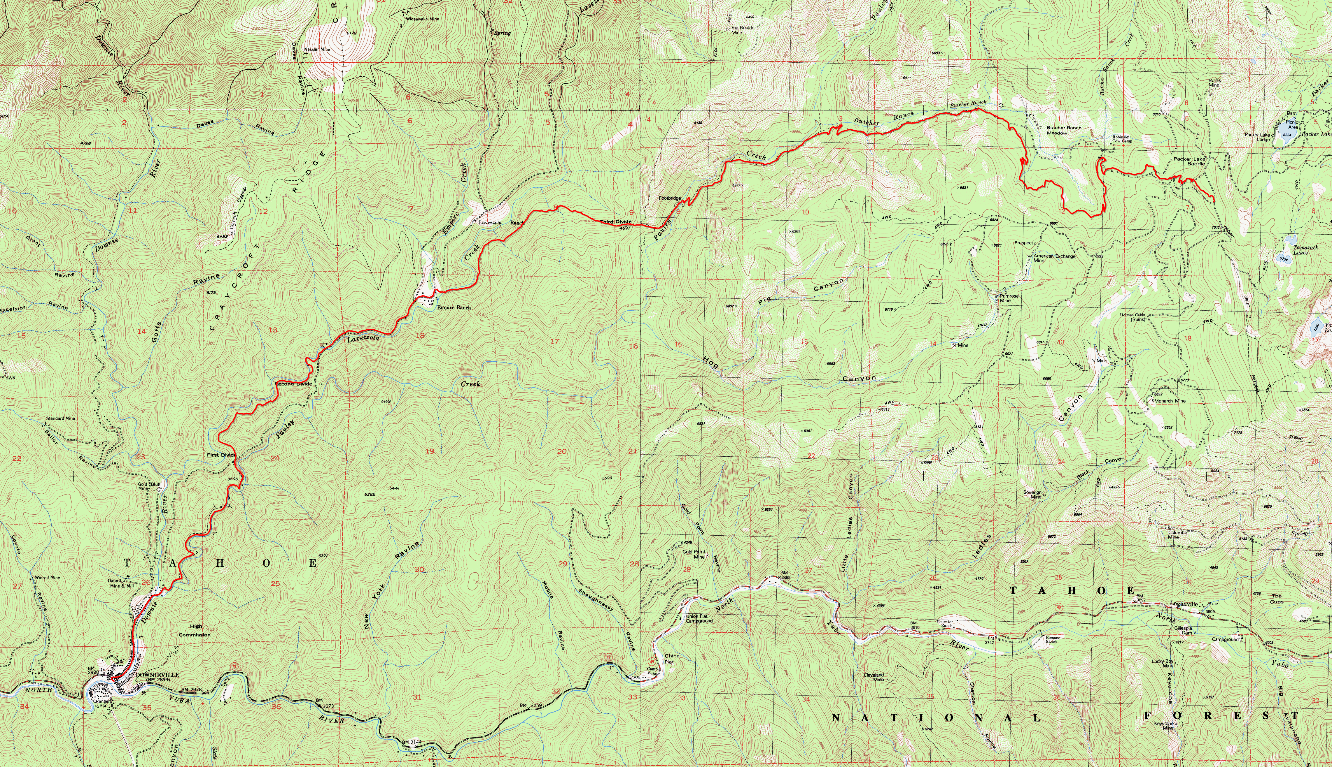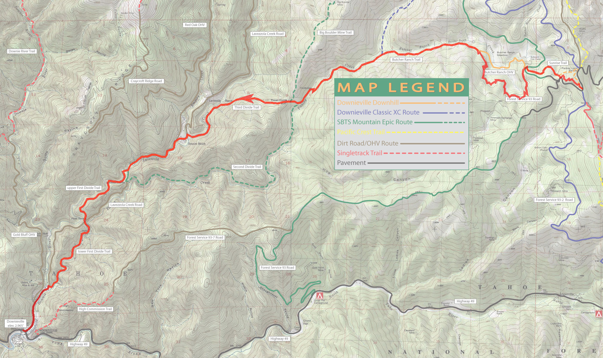 Downieville (Suggestion 1) 75% SINGLETRACK19% FIRE ROAD6% ROAD ![]() THE LOCATIONDownieville is a tiny gold rush town that today is a little slice of mountain-biking heaven. Arguably, this area's greatest claim to fame is its hosting of the Downieville Classic races. The most popular rides at Downieville are one-way shuttle rides, involving getting on a shuttle from the town center, being driven to a trailhead, and doing a ride that ends right back at the town center after thousands of feet of descent and usually (though not always) with very little extended climbing in the process. The most famous of these is the Downieville Downhill, which, at the time of this writing, continues to follow a close variant of the route shown on this page, and which also happened to be the course of one of the Downieville Classic races and, it's probably safe to say, the ride that has put Downieville on the map. (The exact route of Downieville Downhill is what I used to represent on this page as well, which you can still find here. The current version of the ride is different from this only to benefit from the newer and more fun singletrack portion at the upper end of Butcher Ranch Trail rather than its older, fire-road routing paralleling that stretch.) That race is billed as the longest and toughest downhill mountain bike race in the country. The course descends through a net elevation loss of 3900 feet over 15 miles, with less than 600 feet of total climb in the process. (Other than a half-mile climb gaining 250 feet right at the end of Butcher Ranch Trail, the total climb figure only adds up to this due to the cumulative effect of the minor ups and downs during the naturally undulating flow of the trail along the nearly flat sections.) A great majority of the shuttled mountain bike rides done in the Downieville area start from "Packer Saddle", and that includes the ride shown on this particular page. This trailhead is about a 35-minute drive away from the town center by shuttle van. There are two outfits that I know of in Downieville that operate shuttles there regularly: Downieville Outfitters The rates of the shuttle rides are (roughly, if not precisely) the same between these two outfits as of this writing and they both follow a regular schedule of shuttle departure times, with fewer runs scheduled from Monday to Thursday, and more runs from Friday to Sunday. In addition, if you are part of a group of (I believe) four riders or more, both of these companies are willing to do a shuttle run purely for your group at any time you want, as well as taking you to trailheads other than Packer Saddle if you so desire, according to what I was told. (If you do plan to do that, I'd highly recommend that you double check this with them first, though.) Do keep in mind that these shuttle companies take advance reservations for their shuttle runs and that runs on popular dates could fill up early. Also keep in mind that a lot of the details that I've listed in this paragraph can vary over the years and may have changed considerably since I've written these. Since this area has snow cover throughout the winter, the season that's suitable for mountain biking is limited. Roughly speaking, you can expect the trails to be cleared enough from snow to be ridable some time in early summer, and be buried again at some point in the fall. You can check the trail conditions via the website of either of the two shuttle operators I've mentioned above. In addition to the option of staying overnight in or near Downieville in order to ride here, if you'll be coming from an area not too far away, such as from the Bay Area, it is entirely possible to arrange to do a ride here as part of a day trip as well. The best finish times for this particular route in the Downieville Downhill race are under one hour. Meanwhile, modest riders like me are bound to spend something close to three hours, if not more, to make it through—at least on your first ride, due to the extra sightseeing that would be involved. This would still leave time for a post-ride meal, the shuttle ride, and some overhead, if your one-way drive time to Downieville isn't more than, say, four hours. However, staying overnight would also make it easier to do more than one ride within the same day, which is fairly commonly done by advanced riders. My personal impression around the time I finished this ride was that an immediate repetition of the same ride on the same day (let alone an alternate route, which is bound to be tougher, since this route is the easiest possible one here) would not have been enticing to me at all. The ride left me completely sated for biking for the day. A few words about trail use safety are in order here. These are trails where world-class bikers ride. Most such advanced riders are inclined to ride fast. Moreover, many of these trails are also legal for motocross riders. So, while you ride here, make sure you keep the notion in the back of your mind at all times that another rider could be fast approaching behind you at any moment and, if you ever find yourself stopped on the trail for whatever reason, make sure you step away and stay away from the trail for your own safety as well as for that of others. Meanwhile, if you're one of the said advanced riders who is able to do this ride at double-digit average speeds, make sure you keep your speed to reasonable levels and don't overdo it. Don't forget that these are multi-use trails and also that some riders, though rare, do ride these routes uphill, and avoid riding at speeds higher than would allow you to stop within your line of sight. That one's generally good advice to any rider under any riding condition anyway; you never know when a newly downed tree may be waiting for you just past the edge of your sightline. THE RIDEFirst of all, let there be no mistake: This is an advanced and challenging ride. Don't let the fact that it's "only a downhill" fool you. Inexperienced riders, and those who mi