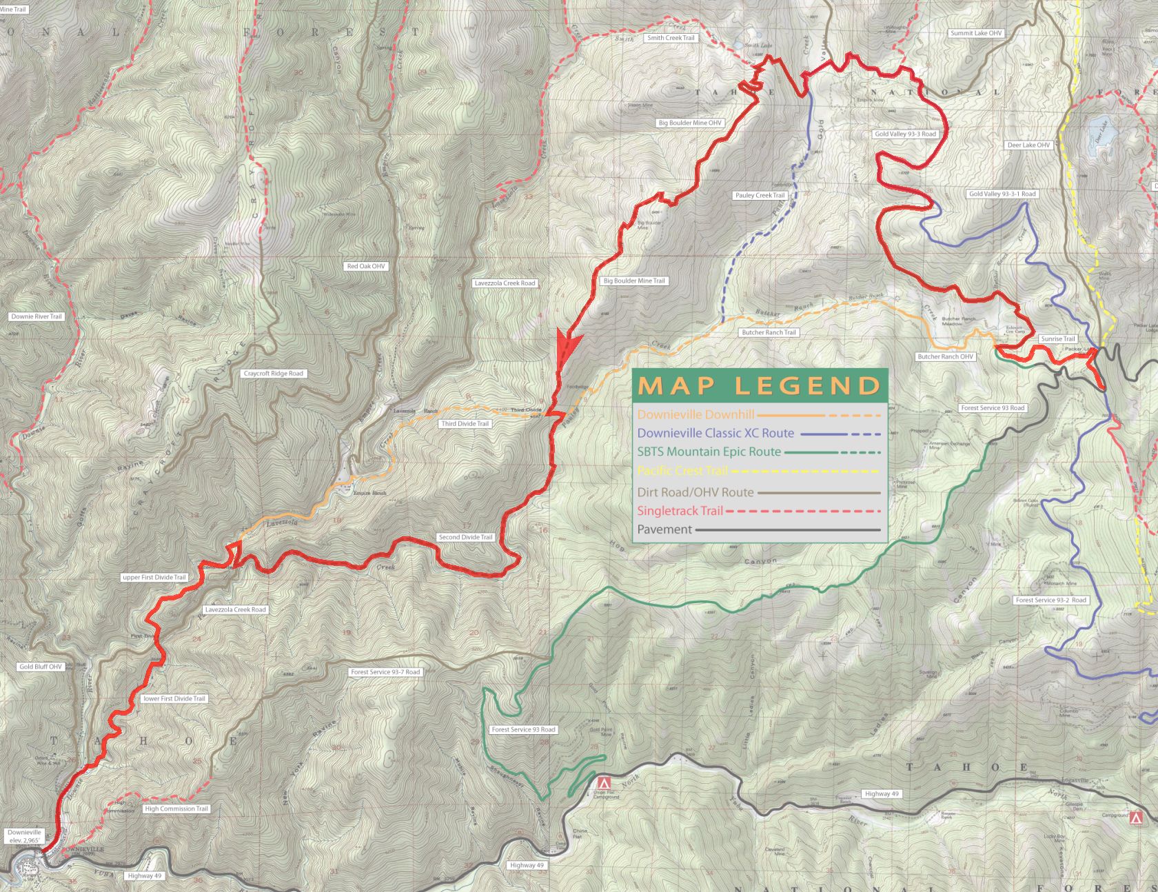 THE LOCATIONDownieville is a tiny gold rush town that today is a little slice of mountain-biking heaven. Arguably, this area's greatest claim to fame is its hosting of the Downieville Classic races. The most popular rides at Downieville are one-way shuttle rides, involving getting on a shuttle from the town center, being driven to a trailhead, and doing a ride that ends right back at the town center after thousands of feet of descent and usually (though not always) with very little extended climbing in the process. The most famous of these is the Downieville Downhill, which also happens to be the course of one of the Downieville Classic races and, it's probably safe to say, the ride that has put Downieville on the map. The ride on this particular page is a variation on that ride that follows a few other trails that surround that main course. A great majority of the shuttled mountain bike rides done in the Downieville area start from "Packer Saddle", and that includes the ride shown on this particular page. This trailhead is about a 35-minute drive away from the town center by shuttle van. There are two outfits that I know of in Downieville that operate shuttles there regularly: Downieville Outfitters The rates of the shuttle rides are (roughly, if not precisely) the same between these two outfits as of this writing and they both follow a regular schedule of shuttle departure times, with fewer runs scheduled from Monday to Thursday, and more runs from Friday to Sunday. In addition, if you are part of a group of (I believe) four riders or more, both of these companies are willing to do a shuttle run purely for your group at any time you want, as well as taking you to trailheads other than Packer Saddle if you so desire, according to what I was told. (If you do plan to do that, I'd highly recommend that you double check this with them first, though.) Do keep in mind that these shuttle companies take advance reservations for their shuttle runs and that runs on popular dates could fill up early. Also keep in mind that a lot of the details that I've listed in this paragraph can vary over the years and may have changed considerably since I've written these. Since this area has snow cover throughout the winter, the season that's suitable for mountain biking is limited. Roughly speaking, you can expect the trails to be cleared enough from snow to be ridable some time in early summer, and be buried again at some point in the fall. You can check the trail conditions via the website of either of the two shuttle operators I've mentioned above. In addition to the option of staying overnight in or near Downieville in order to ride here, if you'll be coming from an area not too far away, such as from the Bay Area, it is entirely possible to arrange to do a ride here as part of a day trip as well. The best finish times for this particular route in the Downieville Downhill race are under one hour. Meanwhile, modest riders like me are bound to spend something close to three hours, if not more, to make it through—at least on your first ride, due to the extra sightseeing that would be involved. This would still leave time for a post-ride meal, the shuttle ride, and some overhead, if your one-way drive time to Downieville isn't more than, say, four hours. However, staying overnight would also make it easier to do more than one ride within the same day, which is fairly commonly done by advanced riders. A few words about trail use safety are in order here. These are trails where world-class bikers ride. Most such advanced riders are inclined to ride fast. Moreover, many of these trails are also legal for motocross riders. So, while you ride here, make sure you keep the notion in the back of your mind at all times that another rider could be fast approaching behind you at any moment and, if you ever find yourself stopped on the trail for whatever reason, make sure you step away and stay away from the trail for your own safety as well as for that of others. Meanwhile, if you're one of the said advanced riders who is able to do this ride at double-digit average speeds, make sure you keep your speed to reasonable levels and don't overdo it. Don't forget that these are multi-use trails and also that some riders, though rare, do ride these routes uphill, and avoid riding at speeds higher than would allow you to stop within your line of sight. That one's generally good advice to any rider under any riding condition anyway; you never know when a newly downed tree may be waiting for you just past the edge of your sightline. THE RIDEThis particular route is one of the options available to those riders who have already done the shorter (and more typical) Downnieville Downhill route and are now looking for a slight variation. What this route achieves essentially is to swap out Butcher Ranch Trail from the typical Downieville Downhill route for a side trip aimed at traversing Big Boulder Trail, as well as exchanging the stretch on Third Divide Trail with the Second Divide Trail. That makes this a longer ride than the standard route (24 miles instead of 15.5) and adds to it a significant amount of climbing (3000 feet of total elevation gain instead of 1150). It's also worth pointing out that Big Boulder Trail is a pretty technical trail. On the trail map of the Downieville area by BikeMapDude, this is the only trail marked with a double black diamond. That doesn't mean that you won't be able to get through it without a dedicated downhill rig, though. I'm not an all-out-gravity-rider kind of biker (quite the contrary, actually), and I haven't had too many hairy moments on this trail. But, if you are relatively new to riding technical singletrack or someone in your company is, you'd be ill-advised to attempt this trail. Also, let there be no mistake: This ride is an advanced and challenging one overall. Inexperienced riders, and those who might feel like bringing along a first-timer riding buddy would quickly find themselves