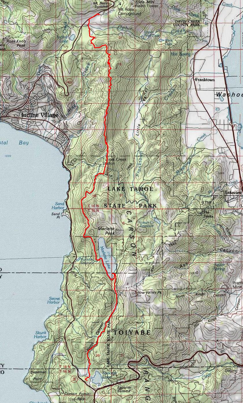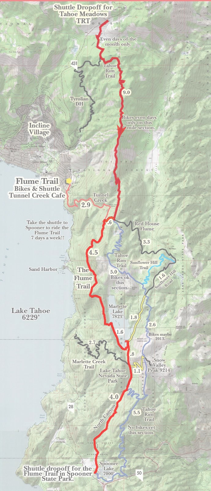 Flume Trail 66% SINGLETRACK34% FIRE ROAD ![]() It's probably safe to say that Flume Trail is the best known biking trail in the Lake Tahoe area. This is mostly due to its dramatic setting (much of it is carved into a very steep hillside) and the spectacular views of Lake Tahoe that it affords, but it's easy to see that a big part of this popularity is due to the low difficulty level of the trail, allowing many more people than just avid mountain bikers to enjoy it. This one is a one-way shuttle ride that incorporates Flume Trail as part of a longer ride that's mostly a descent. If you're reading this page only with an interest in riding Flume Trail itself, you should know that this route is not the most typical way of riding that trail. The most common (and shortest) route for riding Flume Trail would start as the reverse of this ride by setting out from the Spooner Lake parking lot, climbing the fire road up North Canyon to Marlette Lake, skirting along the western shore of that lake to Marlette Dam where you can pick up Flume Trail, following the trail to its northern end and taking Tunnel Creek Road down to Route 28. The connection between the end of the ride and the beginning would be by a shuttle. The safer bet would be to park at the Tunnel Creek Shuttle Station near the bottom of Tunnel Creek Road, and to take the shuttle from there to start the ride from Spooner Lake. An alternative could be to park at Spooner Lake and start the ride there, only to pick the shuttle at the end of your ride to return to your car. As of this writing, this shuttle, operated by the Flume Trail Bikes shop, runs from July to November regularly between 2:00 to 5:00 on the hour, and can be reserved for other times by prior arrangement. Make sure you check with them before you rely on any of this information, though. Despite being significantly longer than that typical Flume Trail ride, the route shown on this page involves only a couple of hundred feet more total elevation gain than that ride, but its climbs are much easier and it throws in an excellent segment on Tahoe Rim Trail into the mix. From that point of view, I would wholeheartedly recommend this particular route to all intermediate and advanced riders as the preferred way of riding Flume Trail. The suggested parking spot link on the left points to the Spooner Lake parking lot, which is where you'll need to board the shuttle that will take you to the beginning of the ride. This shuttle is operated by Flume Trail Bikes as well. You'll have to ask for the "Tahoe Meadows Rim Trail shuttle", however. If you simply ask for "a shuttle" or "the Flume Trail shuttle", they're more likely to assume you're referring to the shuttle to or from the Tunnel Creek Station, which won't work for you for this ride. One bit of trivia that you might find interesting is that the part-owner of Flume Trail Bikes is Max Jones, who is the person who spearheaded the use of Flume Trail as a recreational trail. There is a fee for parking at the Spooner Lake parking lot. At the time I did this ride, this fee was $10 for a vehicle carrying up to four mountain bikes. Obviously, the Lake Tahoe area has snow cover in the winter and this naturally applies to the locale of this ride too. I'm not too closely familiar with the range of dates between which snow cover should be expected along this particular ride route, but I wouldn't plan anything between November and April without closely following the "current conditions" information available on sources like the Flume Trail Bikes website at the link I've provided above. The ride begins from the trailhead of Tahoe Rim Trail on Mount Rose Highway (Route 431) at Tahoe Meadows where the shuttle drops you off. One very important caveat is that the segment of Tahoe Rim Trail that constitutes the first 8.5 miles of this ride is open to bikes only on even-numbered days of the month. Make sure you don't neglect to take that into account when planning your ride. This portion of the ride starts out by a gentle glide through the idyllic Tahoe Meadows, which seems to be fairly popular with families and casual trail users. You quickly find yourself climbing as you leave those crowds behind, but the portion of the trail that feels like a real climb is over in less than a mile, just as you're beginning to warm up. For the following seven miles, this trail closely follows the spine of a ridge that overlooks Incline Village and Lake Tahoe on one side and features occasional views toward Lake Washoe on the other. This is a gorgeous singletrack trail through a boulder-strewn landscape that's lightly wooded with a variety of picturesque conifer trees. The trail is much more technical than Flume Trail. There are frequent steps and clusters of rocks or boulders. However, it's not like you need to be a seasoned biker to make it through this trail at all. Much of it is a smooth and sandy singletrack. It's just that some tricky trail features will arrive fairly frequently, even though inexperienced riders can easily stop and walk a few feet to make it across any of them. There are no steep climbs or descents along this segment, nor many steep drop-offs next to the trail (maybe a couple). As we were doing the ride, my riding buddies and I were unanimous in the opinion that the ride would have been completely worthwhile even if it consisted of this segment on Tahoe Rim Trail alone. Tahoe Rim Trail eventually emerges onto a wide clearing that is its junction with Tunnel Creek Road. Once you're there, what separates you from the beginning of Flume Trail will only be a half-mile descent down a steep fire road. The grade of this descent hovers around -13% and the surface is occasionally rutty and frequently very sandy. Flume Trail starts at a signed junction and continues almost flatly along a steep (sometimes very steep) hillside directly overlooking Lake Tahoe for just over four miles. This trail used to be an aqueduct (a "flume") that carried water from Marlett