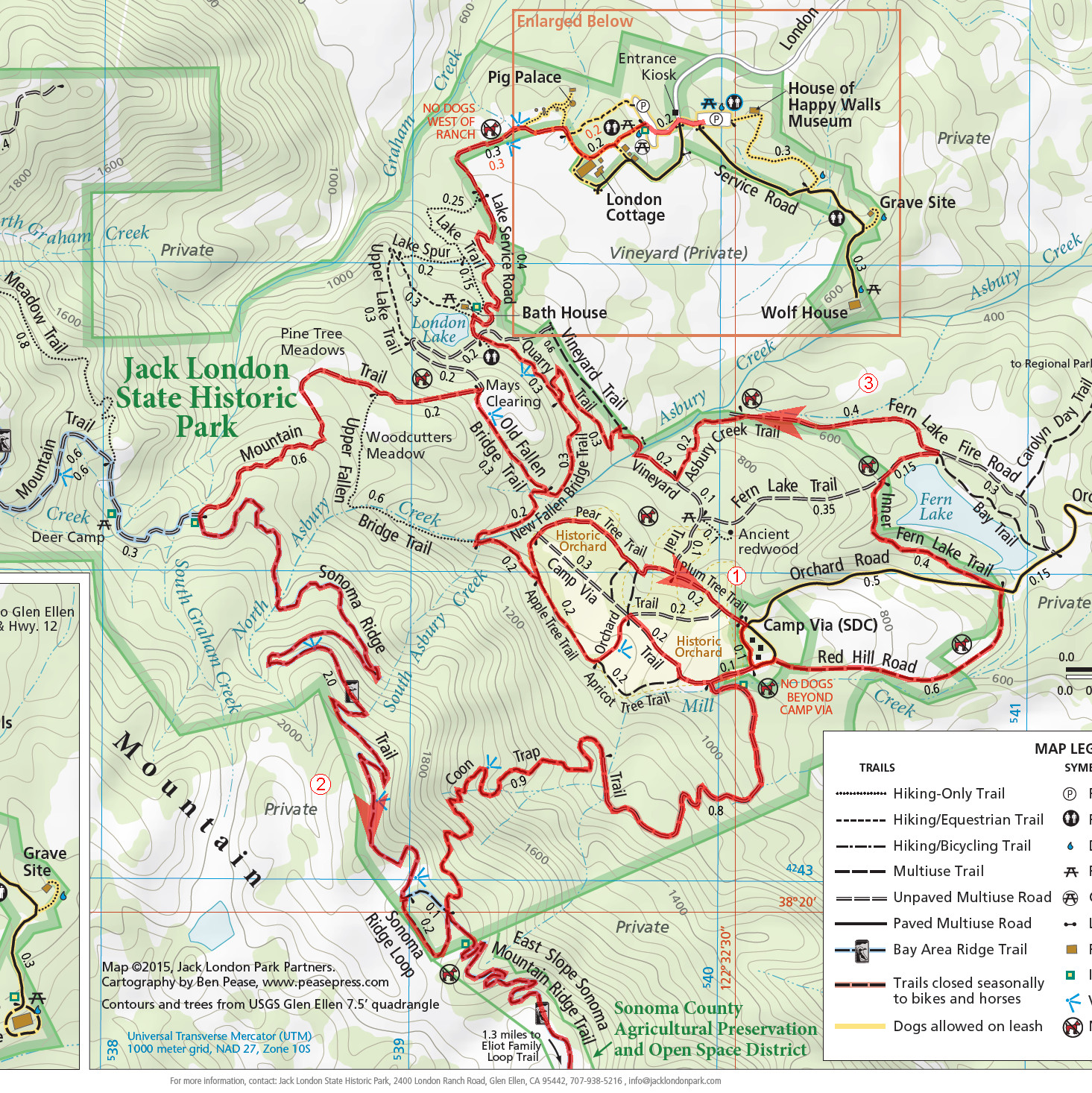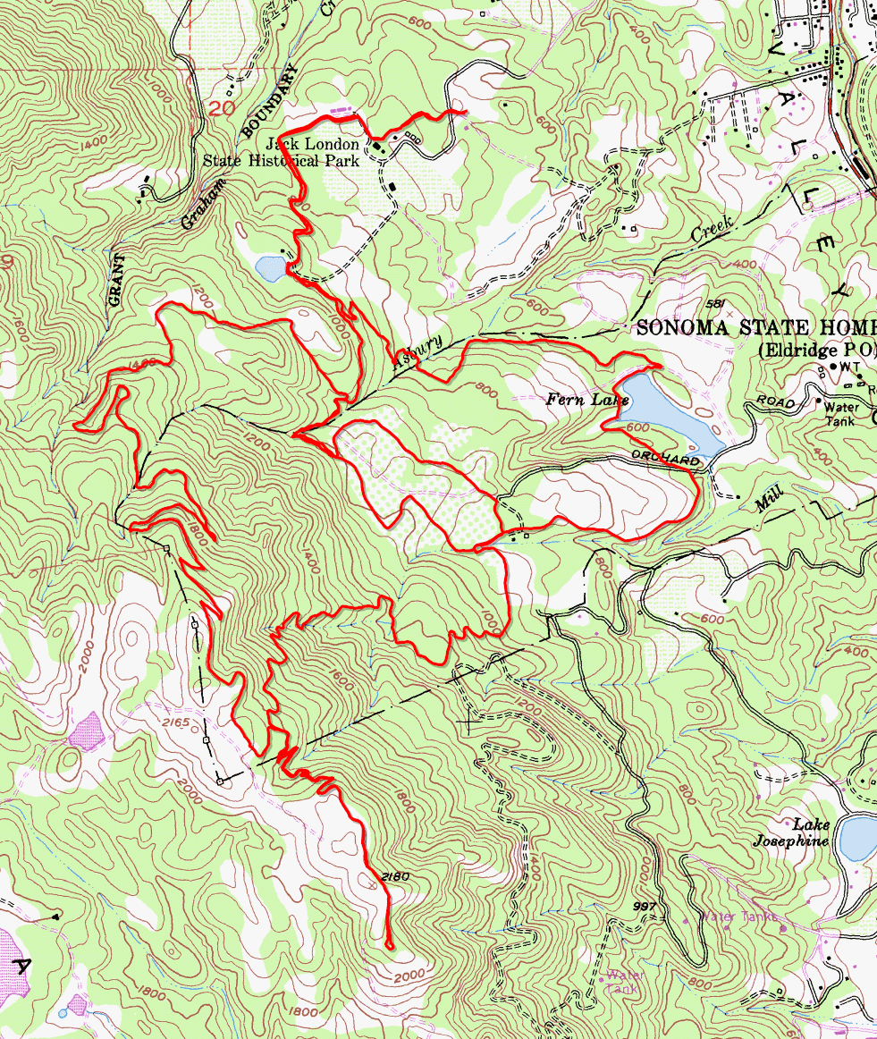 Jack London Park 67% SINGLETRACK30% FIRE ROAD3% ROAD ![]() As a candidate for a bike ride, Jack London State Historic Park is a ride location that I'd been consciously ignoring for a long time. The reason was my long-standing impression that this park doesn't have good biking trails and that it offers little more than steep fire road climbs. When I did finally decide to try out this ride, part of me was still expecting the experience to be more like trying out a bike ride in a park that's popular mainly with hikers. This ride showed me how wrong I was. While the trail network of Jack London Park does have more than its fair share of steep climbs (more on that below), it also features way more bike-legal narrow trails than I was expecting. This is especially so in comparison to my mistaken expectations, which stemmed from impressions I had gained when I hiked here in an earlier life, which was well over a decade earlier than this ride. When I hiked here in 2004, the total trail mileage in the park was very limited and it seemed that very little of it was of a type that would be interesting to a mountain biker. When I look at a trail map of the park from 2008, I see that at least one trail segment I used on this ride wasn't yet legal for bikes (Old Fallen Bridge Trail). In addition, one fun leg of the ride (East Slope Sonoma Mountain Ridge Trail) is a 2015 introduction. So, my prejudice may not have been wholly unfounded, but I certainly could have devoted more attention to this park earlier than I did. The trails at Jack London Park are not technical in the sense in which a seasoned mountain biker would understand that term. One possible exception to this is the descent on Coon Trap Trail, which is steep enough and sometimes rough enough to pose problems to inexperienced riders. Advanced riders, meanwhile, may not think much of this descent's difficulty, other than the fact that it's fast. One exception to this may be one particular spot that's so steep that even bolder riders may take a pause. The terrain of the park actually has some parts that are quite rocky, which reminded me of Annadel, especially due to its proximity. But this rockiness isn't spread throughout all of the trail mileage. It's only clustered in a few places. One of the more commonly encountered things on the ride, and possibly the closest thing to a "technical trail feature" on this route, is a form of "pavement" of roughly hewn rocks used in spots where the trail appears to suffer from drainage problems. Greener riders may feel their skills tested by some of these, though many of these may not even be noticed by experienced bikers. Few of the trails on this ride maintain a judicious grade with any level of consistency, though the ones that actually do add up to quite a bit of mileage. A common theme here seems to be short and punchy climbs that can come at you at any moment, and sometimes for little apparent reason. This is true mostly of the fire roads (with Mountain Trail being one of the worst offenders), though I've noticed it on singletrack trails as well. The latter may sound like they could be meant as "playful trail undulations" added for fun, but I didn't feel the execution was well enough to qualify for that justification, and some examples were on older trails that appear to have transformed to singletrack only over time. The park features two large parking lots. With only a single ride here under my belt, I don't have any idea as to how crowded these can get. If they can, I didn't see any good backup parking options nearby. In such cases, it should be feasible to park near the Glen Ellen town center and bike your way up London Ranch Road from there, even if this adds nearly 500 feet to the ride's total elevation gain. Entering the park by car for day use is subject to a $10 fee as of 2020, and you pay at a gatehouse featuring an attendant. I haven't checked whether entering the park by bike is subject to any charge. The ride begins by taking you through some of the historic, stone buildings of Jack London Ranch. As you head into the park, you initially skirt around the Jack London Vineyard. Some of the steeper climbs of the ride greet you as soon as you turn away from this vineyard and start climbing the uphill portion of Lake Service Road. However, this particular ride route diverts you off that fire-road climb and onto some singletrack after only a quarter mile of suffering. On this diversion, Quarry Trail followed by New Fallen Bridge Trail serve as a nice, shaded singletrack stretch that continues level on average. Here, I've also included a sub-loop to explore the "historic orchard" area of the ranch. There's actually not a lot of this orchard to be seen in practice, with the exception of the southwestern corner of the loop. So, if that doesn't sound that enticing to you, you wouldn't miss out too much if you leave out the orchard, although the fact that a brief portion of the loop is singletrack will boost your overall singletrack mileage a little bit and the portion of New Fallen Bridge Trail that you use for connecting to the loop is also a quite fun singletrack. Whether you do the orchard sub-loop or not, I do find it worthwhile to take the roundabout singletrack route over Quarry, New Fallen Bridge, and Old Fallen Bridge Trails to bypass a short, early stretch of Mountain Trail. Old Fallen Bridge Trail does hand you off to Mountain Trail eventually anyway, on the edge of a small, sunny meadow marked as "Mays Clearing" on the park's map. Although the nearly half-mile segment of the ride on Old Fallen Bridge Trail is also a significant climb, the part that begins when you return to Mountain Trail feels like one of the tougher climbing stretches of the ride. You only cover about one more mile on Mountain Trail before you turn back onto singletrack and the average slope of this mile (7.5%) is even less than that of Old Fallen Bridge Trail (10%), but it's not even and it seems to have a disproportion