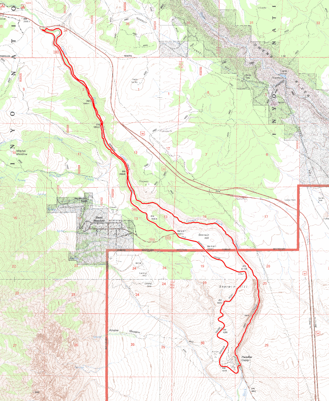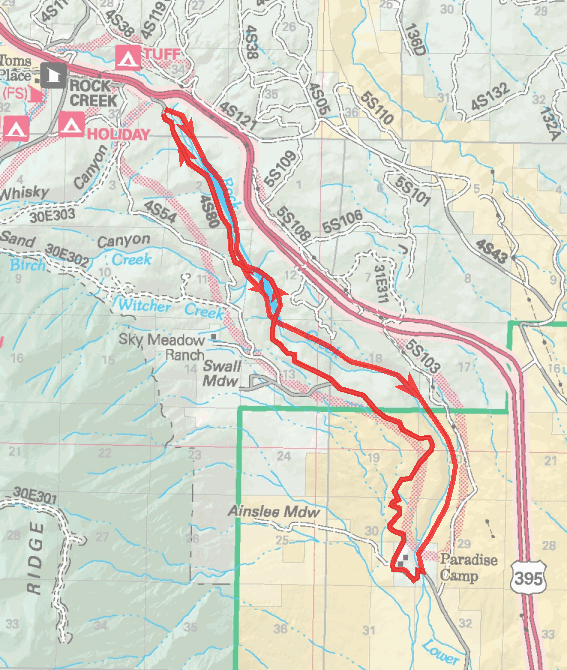 Lower Rock Creek Trail 48% SINGLETRACK1% FIRE ROAD51% ROAD ![]() Lower Rock Creek Trail is a fun, fairly narrow, nearly eight-mile-long, singletrack descent that closely follows its namesake creek through a narrow canyon it has carved into the plains near Bishop, California. The trail is part of the Inyo National Forest (except the last quarter of its length) and, while I don't have any specifics about its history, judging at least by a sign at its beginning that introduces it as the "Lower Rock Creek Mountain Bike Trail", it seems to have been built primarily with mountain biking in mind. If that leads you to expect that it's a fun trail, you wouldn't be wrong. The terrain is rocky, the canyon narrow, the trail usually twisty, and the creek bed it follows is quite pretty. This results in a ride route that provides a good amount technical mountain biking fun, and can be tailored to one's skill level to a certain extent. Let me start by elaborating on that last remark first. The trail shares the space in this canyon with Lower Rock Creek Road (Old Sherwin Grade) for about half of its length. As you enter the second half of the descent down the canyon, Lower Rock Creek Road climbs out of the canyon to follow the much easier path down the higher flats alongside the canyon instead, because the canyon becomes even narrower and its sides get even steeper in its lower half. This also marks a significant switch in the character of the trail. The ride down Lower Rock Creek Trail can be considered to have two parts that are distinctly different from each other. The part of the trail up to its second crossing of Lower Rock Creek Road is intermediate level at best, in terms of technical difficulty. Not long after that second road crossing, however, things start getting a bit hairier. The trail is much more frequently interrupted with boulder steps and goes over clusters of large rocks. The going was slow for me around this part. There is about a mile or a mile-and-a-quarter long segment of trail that's pretty rocky. Still, things don't get too bad with the exception of one section perhaps a quarter mile in length where my ride turned more into a rock scramble while shouldering my bike. This was the point in the ride where I started worrying about how much my estimated time of finishing the ride would be affected if the entire remainder of the trail were just like this. Thankfully, it doesn't take long for the trail to regain a good flow and things end on a positive note. Overall, the technical trail features on this ride are only of two kinds: (1) piles or clusters of large rocks you have to go over or through, (2) trail surfaces soft and slippery enough to impact your stability. Having said that, the split personality of the two halves of the trail is not as extreme as some written descriptions had originally led me to believe. I was originally set up to expect the difference to be like that between beginner level and expert level. After trying the ride myself, I'd be more inclined to describe the two parts of the trail to be more like intermediate level and advanced intermediate level instead. The section of the trail before the second road crossing isn't strictly beginner-level necessarily; there were a number of techy obstacles even in that part, and that portion was still very fun and twisty. Meanwhile, although the second part got seriously tough, it only did so mainly in a limited stretch, and the rest of it was manageable for any riders at intermediate level or above. So, it wouldn't be unreasonable for a less experienced rider to attempt only the relatively easy part of the trail and return via road from the second road crossing on the trail, while more confident riders can go for the whole enchilada. While I don't know the area well enough to claim there aren't too many other mountain bike trails in this vicinity, I can at least attest that no other trails seem to connect to Lower Rock Creek Trail directly. Therefore, there are only a handful of meaningful ways of riding this trail in its entirety: you can either descend it by doing a shuttle ride, or you can do just the trail itself as an out-and-back ride, or you can turn it into a loop by including a road segment on Lower Rock Creek Road. As far as I understand, shuttle rides on Lower Rock Creek Trail are pretty popular. Unfortunately, that wasn't an option for me since I didn't have anyone joining me for this ride whose car could be used for the return trip. Doing a 15-plus-mile out-and-back ride on this trail was something I didn't have time for and I would worry about how strenuous that would be anyway. So, I opted to ride the trail as part of a mixed loop where I returned via the road. Even when considering the loop option, you have a choice between starting at the bottom to do the road climb first and starting at the top to do the road climb as a return. I chose the latter, and this was mainly to avoid extending my drive back home by another 13 miles (to drive to the southern end of the trail), but also because I don't exactly savor the thought of doing the technical descent down the difficult portion of Lower Rock Creek with semi-tired legs after a significant climb. Starting the loop at the top also leaves the door open for a rider to decide that they want to bail out before finishing the trail and start the return climb up the road early (e.g., at the second crossing), rather than being forced to finish the technical part of the trail just to be able to return to the car. The parking area that I point out at the link on the left is a small roadside pocket right at the trailhead. This spot has space for only five or six cars, but there are at least two larger gravel clearings nearby that are suitable for parking, one on Route 395 and one just a few hundred feet down Lower Rock Creek Road. Those who would like to start the ride from the lower end of the trail or do it as a shuttle ride will be glad to know that there is a small, d