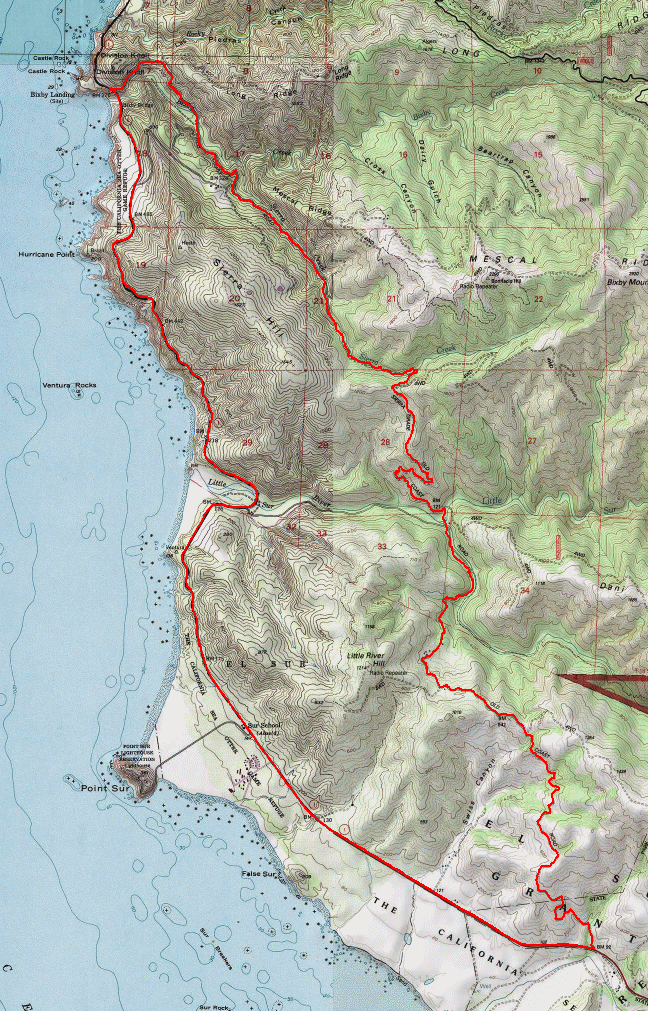 Old Coast Road 56% FIRE ROAD44% ROAD ![]() This is a mixed ride that follows the dirt Old Coast Road through a slice of the Big Sur back country and returns via Highway 1 to complete a loop. The ride can be summed up in a nutshell as "two pairs of climb/descents over a dirt road, followed by a return via a paved road". That might be underestimating the return portion over Highway 1, though, because there's a good amount of pedaling to be done on that leg of the ride too, but it wouldn't be shortselling the biking appeal of the overall route, because this ride has little appeal from a pure mountain biking point of view. You should think of it more as an "excursion by bike". However, that's not to say that it doesn't have plenty of other factors going for it or that it's not enjoyable. Old Coast Road is not a fire road in the way a Bay Area mountain biker would typically understand it. It's actually a public road that's open to everyone. It just happens to have a dirt and gravel surface. As its name suggests, it used to be the main coastal thoroughfare along this portion of the coast until Bixby Bridge was completed and Highway 1 bypassed Old Coast Road in the 1930s. The road is not even that deserted, in case its location might suggest to you that it would be; I've encountered six motor vehicles even on its most remote stretches, and many more over its parts that are close to Highway 1, not to mention the numerous private homes you'll encounter along the road. Still, the road passes through some of the prettiest nature you'll find anywhere in the area. You'll be pedaling along beautifully lush and rugged creek beds, through redwood groves where the ground between the majestic tree trunks are carpeted with clover in a story-book-like setting, and you'll be catching great views to the surrounding mountains and to the ocean fairly regularly. Add to that the rugged beauty of the coastline that will accompany you on the Highway 1 segment of the ride, along with the potentially gorgeous display of dune flower color along that road (they seemed to be going especially wild when I did this ride in early July) and you end up with a good slice of California coastal bliss, even if technical biking fun is not one of the factors that will play into it. Taking the trip on a bicycle will at least allow you to stop and smell the flowers more easily, literally as well as figuratively. The best direction for this loop is a detail about which I'm a bit ambivalent. I feel it's safe to say that the more popular direction for this loop is actually counter-clockwise. The few other riders I've encountered on this ride were riding in that direction, and most written resources recommend that direction as well. Two good reasons for doing it that way would be to be riding on the seaward side of Highway 1 for better views and for taking Highway 1 in the southbound direction so that the prevailing winds are in your back. My reason for doing this loop clockwise was to avoid doing the steepest climb on the route. This climb is labeled as "Sierra Grade" on the USGS topographic map and it appears as the long descent that follows the first major climb on the ride route on this page. The grade of this 1.5-mile portion of Old Coast Road is quite steady at 12%. By doing the ride clockwise, I've effectively replaced this with a 3-mile climb instead, whose steepest half-mile stretch averages only 10.5% grade. If you can stomach the 1.5-mile 12% climb (keeping in mind that short stretches of that will occasionally reach up to 15% or more), then you should certainly do the ride counter-clockwise and enjoy that 3-mile slope as a gentle glide along a pretty, redwood-covered creek bed instead. The suggested parking spot for this ride is a tourist parking lot on the northern end of Bixby Bridge. There's space there for about 10 or 12 cars (if people park head-in, as they should). There's also some space for roadside parking along the first few yards of Old Coast Road itself, right across the road from there. You can expect some trouble finding available space here around midday, especially on weekends. If you arrive early, I wouldn't expect you to have a problem. When I showed up at 9:00 AM on a Saturday, mine was the only car there, but all parking spaces were full when I finished my ride in the early afternoon. There are head-in parking spaces along Highway 1 at the southern end of Old Coast Road as well, which could accommodate about 10 cars at most, in my opinion. In case you have difficulty finding any parking at one of these places, your "plan B" for parking could be any one of the numerous roadside "vista point" pockets along the northern stretches of Highway 1 that are traversed on this loop. When you first start out on Old Coast Road on this ride, after gaining a very small amount of elevation, you first descend to the creek bed of Sierra Creek. These early stretches of the ride also happen to provide a few good views back toward Bixby Bridge, so don't neglect to look back along the first half mile or so of the ride. After crossing the creek, the road starts a three-mile climb, which never deviates far from this creek bed except for its last quarter mile. This is the part of the ride with the lushest tree cover. While Old Coast Road starts out as a very smooth and extra-wide dirt road, it narrows as you gain elevation, though it never gets rutty or too rocky. Roughly the first half-mile of this climb is the steepest, averaging a hair under 10.5% grade. The rest of it is gentler, especially around the middle of the climb. As you crest that first climb, you emerge from tree cover and get your first good look at the surrounding hills and at the ocean while you start descending on Sierra Grade. The width of the road increases once again in this segment. Actually, it reaches the width of a boulevard at some spots. This extra twisty downhill segment is also quite fun, as a matter of fact, and even gets somewhat rocky near the end o