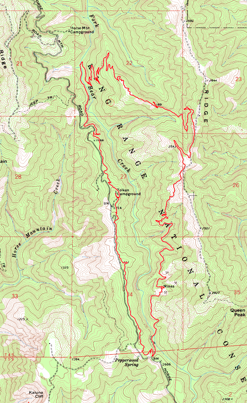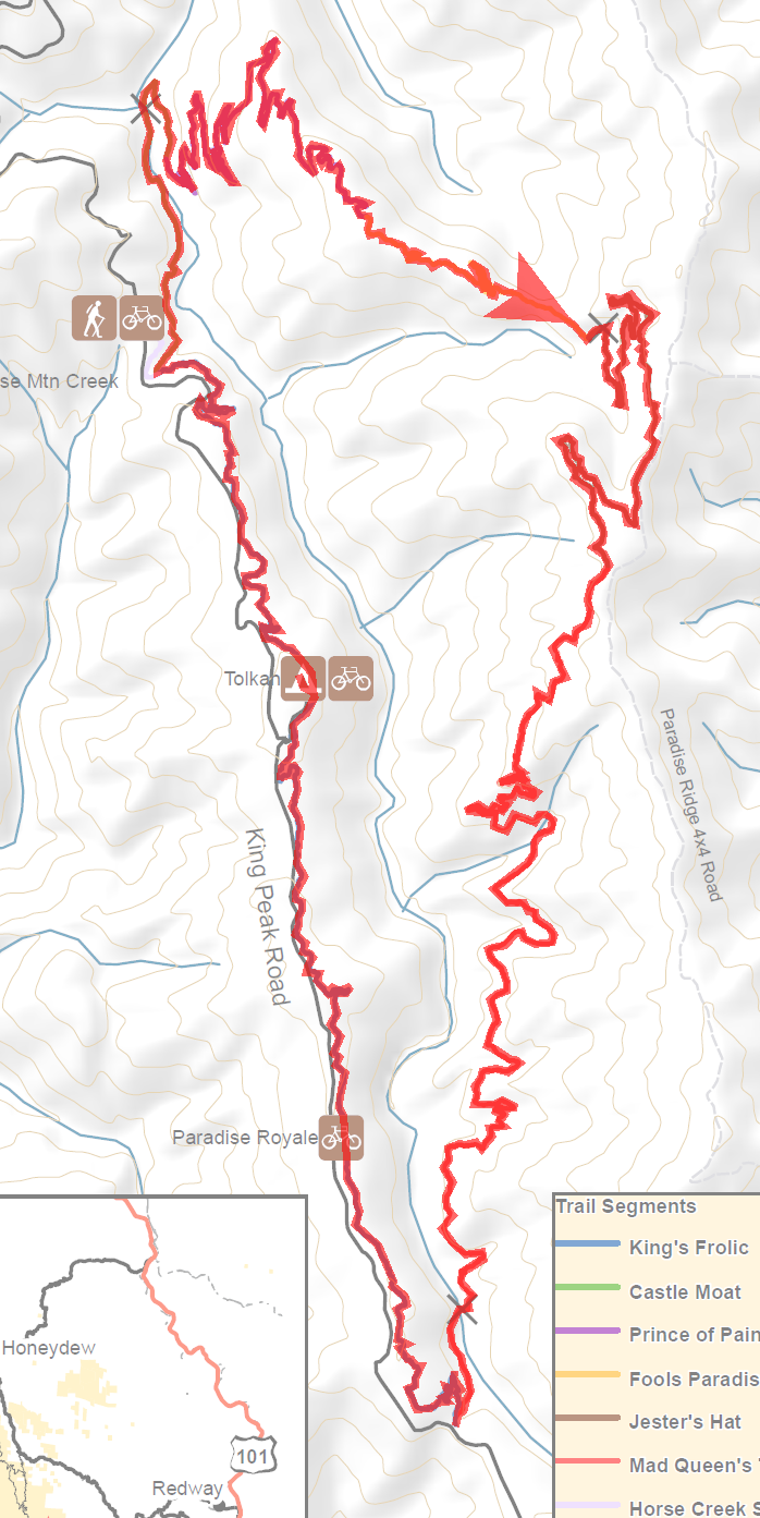 Paradise Royale 94% SINGLETRACK6% FIRE ROAD ![]() Paradise Royale might be in the middle of nowhere, but it deserves to be on the radar of any self-respecting mountain biker in California. This part of the California coast is known as the "Lost Coast". That should be enough to tell you how out of the way this place is. Built as a trail system optimized for mountain biking from day one, I read that this loop opened to the public in 2008 as a result of work started in 2005 out of cooperation between the IMBA and the Bureau of Land Management. You'd have to admit the appeal of such a biking loop that is billed as being geared toward higher skill levels. IMBA explains that the motivation for this loop came about in response to the loss of biking trails due to the North Coast Wilderness Bill. Speaking of being geared for mountain biking, I've seen one account of this ride mentioning that all other trail users need to yield to mountain bikes here because the trails were designed for bikes. I'm not sure if that's formally true, but I do remember noticing that some trail markers I saw during the ride feature only a bicycle logo under a heading that reads "trail open to:". Some clarifications first. There is no shortage of sources that call this a 14-mile loop, including most official maps and written sources. However, it's not a 14-mile loop. It may have been planned that way initially, but the loop as it exists today is only 11.5 miles long. (However, it does feel like a 15-mile loop in terms of physical challenge by the standards of most Bay Area singletrack.) The only explanation for that 2.5-mile discrepancy that I can imagine is the possibility that the 14-mile figure might be including the length of the few short loops that make up the Tolkan Terrain Park. (More on that below.) In addition, some online maps and descriptions of the ride indicate that the two major crossings on the ride (across South Fork Bear Creek) have no bridges and will require you to carry your bike. That information is out of date. There are now sturdy bridges at both of those crossings. All sources you'll find on Paradise Royale will also be calling this a "100% singletrack" loop. That's almost true. However, there is a roughly half-mile portion of Jester's Hat Trail that clearly follows the path of an old fire road. It's not unreasonable to consider even that stretch singletrack, because it's a very aged road and it's moderately narrowed by vegetation and accumulated organic debris, and even has sapling trees growing out of the old road surface whose trunks are already as thick as my wrist. However, I'd rather designate that portion as fire road anyway and explain the specifics in the ride description as I just have, because it's not only the situation of the trail but also the riding sensation on it that is closer to a fire road in that section than it is to singletrack—especially in the unfun (uphill) direction in which you ride it. Moreover, even if I hadn't included that half mile in the fire road category, the ride would still have added up to only 99% singletrack by my traditional calculation (i.e., every last feet of the GPS track should be counted), because the short, dirt-road approach portion from my parking spot to the trailhead and its repetition on the return round up to 1% of the route plot you see on this page. As I've already touched upon, every source I've seen referring to the Paradise Royale loop places it at an advanced difficulty level. I think that's fair. However, it's not like the trails are covered in trail features like clusters of tree roots, steps, and rock gardens. There were a couple of root cascades that forced me to stop, as well as a virtually unridable spot that made me do a double take. Overall, though, the trail surfaces are relatively even. The technical difficulty arises mostly from the tight switchbacks, abrupt twists and changes in attitude, a few sections that feel exposed, the occasional steep and slippery descent, and the loose rocks that occasionally become a significant hazard. This is a fast and flowy route (on the descents anyway). The "Tolkan Terrain Park" I mentioned above is a bike park next to the Tolkan Campground. It features a pump track and some stunts like several jumps, wall rides, etc. For those who enjoy it, this presents a handy option for prolonging the fun if you happen to start the ride from where I point out and are left wanting more when you finish the loop. I've encountered a couple of instances where the trails on this loop were referred to as "flow trails". I can see where that's coming from. Most trails on this loop go over berms repeatedly and, in some places, the repeating pattern seems to consist of carrying momentum into a steep dip followed by a few revolutions of the pedals to climb the last split second of the hump that follows it. There are also several highly banked hairpin turns that are wide enough to maintain some speed through, as well as a few notable curves on Mad Queen's Tango that are meant to be attacked aggressively. However, if these are formally intended as flow trails, then they fall somewhere in between the highly specialized design of Endor Trail at Camp Tamarancho and the highly diluted flow trails at Crockett Hills. There are at least three trailheads that would make reasonably good sense as the starting point for this loop. The first is at the southernmost point of the route. The advantage of this one is that it's the first one you encounter on your way in, so it seriously reduces the distance you need to drive on King Peak Road, which is a dirt road that's quite rough in some places at the time I write this. The disadvantage is that there isn't enough parking space for anything more than four or five cars there. The second one is the closest one to being the "main trailhead" for this loop, and that's not only because it's called the "Paradise Royale Trailhead". It has parking spaces for something on the order of 10 car